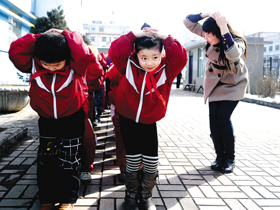 3月2日,太原市东岗小学的学生在学习避险技巧。当日,山西省太原市东岗小学举行“应急避险逃生自救演习”,将安全教育作为学生的开学第一课,以提高学生的安全意识和自救自护能力。(燕雁 摄)