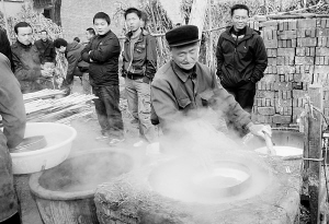 鹿邑县城郊乡槐树刘村是一个远近闻名的制作粉皮的村子。该村加工的粉皮有耐煮、爽口等特点,深受安徽、山东等地人的喜爱。图为该村村民刘登科在制作粉皮的情形。( 胡洪涛 胡海云 摄)