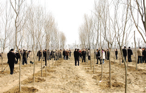阳春三月,大地复苏,正是植树造林的好时节。依托黄河故道改建而成的文昌生态园,是市区增加绿地、美化环境的理想之地。上午9时20分,市领导吕彩霞、李洪民、穆仁先、李明方、梅宝菊、刘继标、李绍彬、史根治、刘国连、王建庄、杨海震、石敬平、张文平等一到这里,就与市直机关干部一起挥锨铲土,植树播绿。大家有的栽树,有的培土,并不时交流着劳动的快乐,使现场呈现了一派热闹非凡的劳动景象。在植树的同时,大家还相互提醒:千万不能只顾数量而忽视质量。在大家的共同努力下,短短半个小时里,文昌生态园内就增添了500多棵大叶女贞和白皮树。