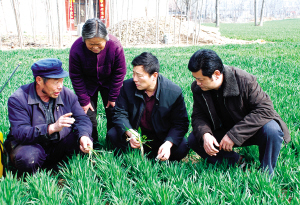 鹿邑县百万亩小麦,由于推广普及良种、配方施肥等技术,目前普遍长势良好。为此,县里组织农业科技人员,深入田间,调查小麦返青情况,适时提出打除草剂、弱苗追肥等管理措施。图为农业技术人员在大河庄村察看小麦生长情况。(胡洪涛 胡海云 摄)