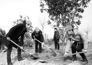 3月12日,周口供电公司青年志愿者一起到绿化点参加义务植树活动。该公司志愿者将植树作为亲近自然、回报自然的公益活动,他们以植树为载体,把播种绿色作为回报社会的长期公益活动,4年来共植树200多棵。(王映 摄 )