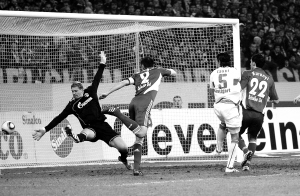 3月12日,斯图加特队球员塔什(右二)头球扳平比分。当日,在2009-2010赛季德甲联赛第26轮的一场比赛中,沙尔克04队主场以2比1战胜斯图加特队。 新华社/路透