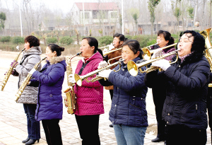 鹿邑县广泛开展精神文明创建活动和农民健身活动,各种文化娱乐组织和设施如雨后春笋般建立起来,农民生活得更加幸福、更有尊严,社会更加和谐。图为鸣鹿办事处白菜园村的农民军乐队在排练节目。 (胡洪涛 胡海云 摄)
