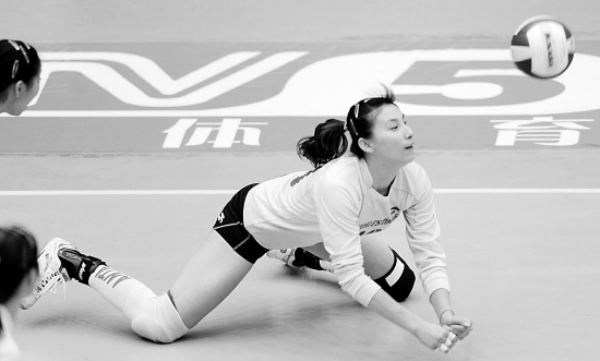 3月20日,天津女排球员李娟在场上救球。当日,在2009-2010赛季全国女排联赛A组总决赛第二场比赛中,天津女排主场以3比0战胜上海女排,双方以1比1的总比分战平。 新华社记者 杨宗友 摄