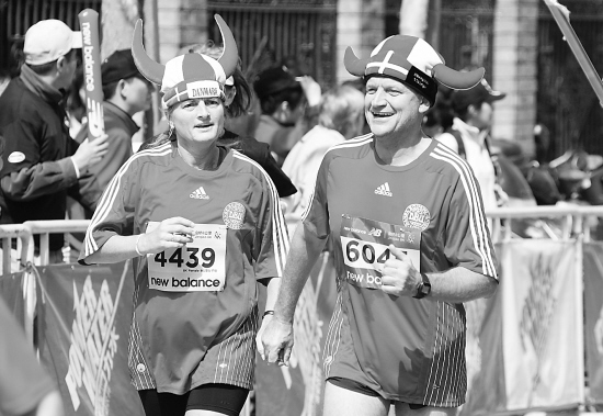 3月21日,两位社区居民身着球迷服饰参加长跑比赛。 当日,以“健康休闲”为理念的上海金桥碧云国际社区第九届长跑比赛在上海浦东新区举行。中外企业代表、社区中外居民3500多人参加了比赛。不少长跑爱好者身着独具匠心的服饰出现在赛道上,为比赛增添了许多幽默色彩。 新华社记者 裴鑫 摄