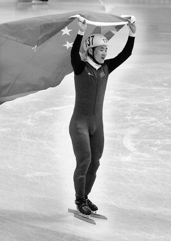 3月20日,中国选手梁文豪获胜后高举国旗庆祝。当日,在保加利亚索菲亚举行的2010年短道速滑世锦赛男子500米决赛中,梁文豪以41秒383的成绩夺得冠军。 新华社发(韦尔科·安格洛夫摄)