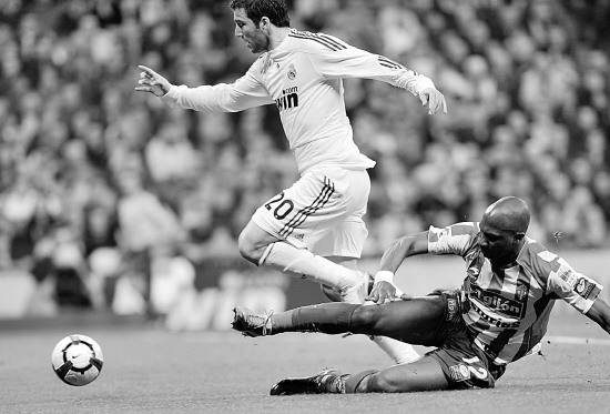 3月20日,皇家马德里队球员伊瓜因(上)在比赛中带球过人。当日,在西班牙足球甲级联赛第27轮比赛中,皇家马德里队主场以3比1战胜希洪竞技队。 新华社记者 陈海通 摄