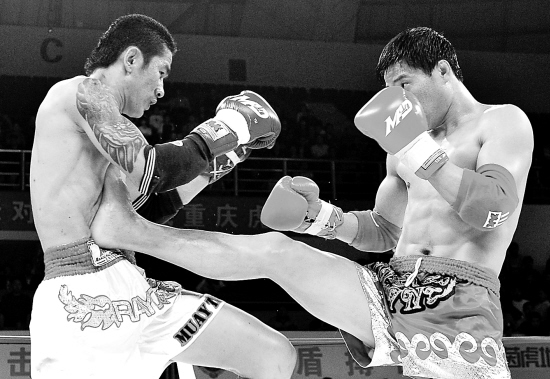 3月20日,张开印(右)与图温坦在比赛中。当日,在2010重庆第五届国际武术搏击王争霸赛(中泰对抗)第二天的比赛中,中国选手张开印战胜泰国选手图温坦。 新华社记者 程敏 摄