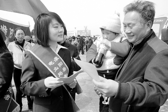 3月21日,中国·淮阳朝祖庙会上游人如织,热闹非凡,淮阳县电业局利用朝祖庙会人多的大好时机,在太昊陵广场上设立咨询台,开展优质服务,当天共发放安全宣传手册8000多份,解决用电疑问32个,收到了良好的宣传效果。(张瑜 摄)