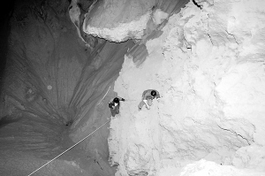 为了生命的甘泉 3月31日,南丹县八圩瑶族乡政府干部韦举坤(右)和立坳村九圩屯村民在一百多米深的山洞里查看水源。自2009年8月以来,广西发生了历史罕见的特重干旱灾情。截至3月29日,全区86个县(市、区)受灾,受灾人口达985.57万,因旱导致饮水困难的人口达300多万。在大灾面前,旱区群众不等不靠,积极自救,全家男女老少齐上阵,上山入地找水源。为了生命之水,大家团结一心,鏖战旱魔。