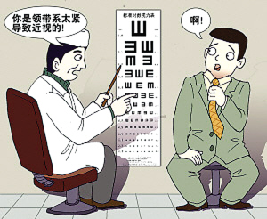 最近,28岁的李先生发觉眼睛有点不对劲,原来1.5的视力,现在稍远点的地方就看不清楚。他到医院检查,视力下降至0.8。与医生一番交谈得知:因领带系得太紧,导致眼睛近视。(新华社 图)
