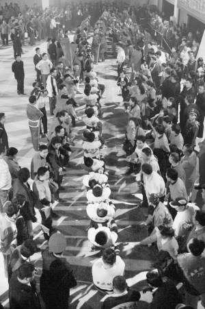 全民健身——“咱们工人有力量”重庆市职工拔河比赛开赛 4月7日,职工代表们给各自的参赛队伍加油鼓劲。当日,来自重庆市27支队伍的600余名运动员参加了由重庆市总工会举办的“咱们工人有力量——健康重庆”杯拔河比赛。他们将通过2天的比赛争夺最后的冠军。