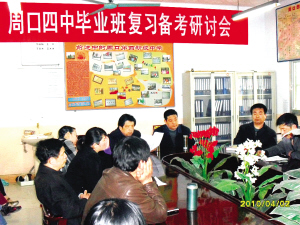 中考临近,周口四中毕业班全体教师近日汇聚一堂,研讨中考复习备考。研讨会上,老师们就学科的特征、考试方向、学生现状和今年的中考命题趋势等问题各抒己见,进行了交流与探讨。图为研讨会现场。