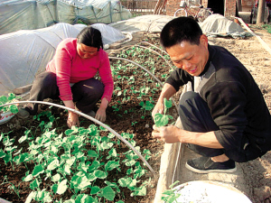 4月11日,商水县平店乡周王村的王志学、李瓒夫妇正在自家的2.5亩“开心农场”里移栽早春黄瓜。近年来,该乡积极引导广大农民调整种植结构,依靠高产高效农业走上脱贫致富之路。(赵永昌 摄)