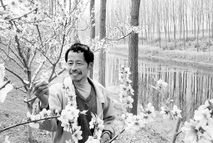 扶沟县固城乡护岭村农民胡耀雷利用河边废地种植7亩桃树、油菜,每到春天,鲜花开满河岸,不但美化了环境,而且增加了收入。图为胡耀雷正在为桃树授粉。(谷志方 摄)