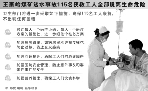 据新华社山西乡宁4月11日电 (记者 叶健) 山西省卫生厅厅长高国顺10日晚间说,截至目前,王家岭煤矿透水事故中获救的115名工人总体情况不错,病情稳定,已没有生命危险。