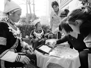 近日,市区的主街道上来了几位少数民族装扮的妇女,她们佩戴着精美的银制饰品,边出售饰品边绣花,吸引了不少市民驻足观看、购买。