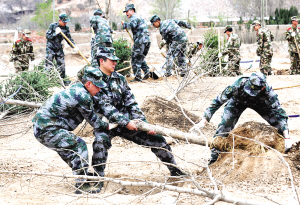 4月12日,部队官兵在地处兰州市郊的沙井驿义务植树。当日,甘肃省在兰州市郊的沙井驿开展义务植树劳动,广大干部群众、驻兰部队官兵、少先队员代表等共同栽种雪松、油松、银杏等乔灌木,为绿化美化黄河北岸播下片片新绿。(新华社记者 韩传号 摄)