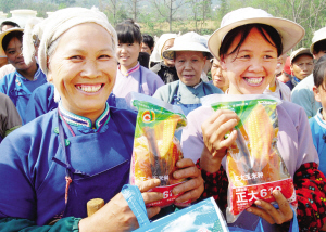 广西壮族自治区农业厅在遭受特大旱灾的那坡县和凤山县举办“抗旱救灾种子”捐赠活动,将总价值48万元的3万斤耐旱高产玉米良种,赠送给3000多户受灾农民,帮助他们抢种、补种,尽快恢复生产。(喻湘泉 摄)
