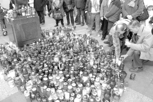 4月11日,人们在波兰首都华沙的无名烈士墓广场参加波兰总统卡钦斯基专机遇难者的悼念仪式。卡钦斯基及夫人乘坐的图-154专机当地时间10日在俄罗斯斯摩棱斯克失事,机上96人无一生还。 新华社记者 马世骏 摄