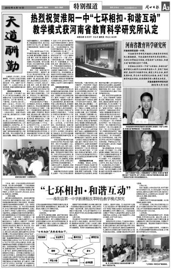 该教学模式的形成不是偶然的,是淮阳一中近几年来注重校本科研的结果。“只教不研则浅,只研不教则空”。学校的科研工作基本形成了“以课堂为契机,以课题为载体,以课堂为依托,创新科研机制,优化科研管理,深化科研工作”的思路,并注重四个结合:学习新课改与提高课堂教学质量相结合;课题研究与日常教研工作相结合;科技创新与教学工作相结合;教研工作与研究性学习相结合。探索、酝酿、拼搏、进取、厚积薄发……在这样的进程中,淮阳一中豪迈地镌刻下了振奋人心的篇章,全面扎实的科研工作之花,通过学校全体师生的精心浇灌,结出了累累硕果。目前,学校承研了省级课题4项,其中《英语新课改中“七环相扣、和谐互动”教学模式的探索与研究》《“七环相扣、和谐互动”教学模式研究》等课题已取得阶段性成果。创新的课堂教学模式已得到了河南省教育厅和河南省教科所有关专家的一致好评。近日,全国“和谐教学”创始人王敏勤教授亲临学校对教学模式进行了具体指导,并提出了许多建设性的意见,同时对该教学模式进行了高度评价。他们称“七环相扣·和谐互动”教学模式的创新,填补了淮阳县乃至周口市在该领域的空白,是淮阳县课堂教学改革的一面旗帜。目前,淮阳县教育体育局专门下发文件,要求全县各中小学认真学习淮阳一中“七环相扣·和谐互动”教学模式。并将4月份定为全县课堂教学改革学习月,以此推动全县课堂教学改革健康有序进行。
