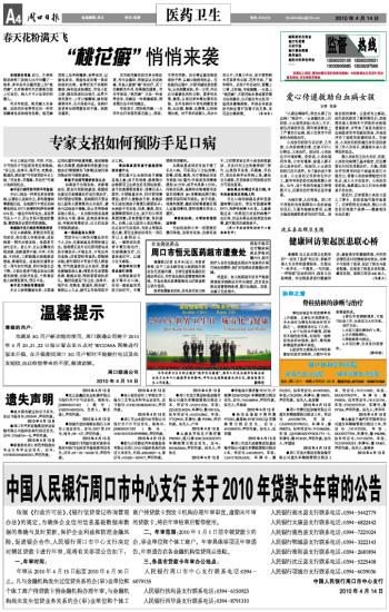 中国人民银行周口市中心支行 关于2010年贷款卡年审的公告