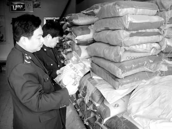 商水县平店工商所积极开展“红盾护农保春耕”专项执法行动,将种子、化肥、农药、农机及零配件、农用成品油列入重点监管对象,切实保护了广大农民的合法权益。图为工商执法人员在农资商店对种子质量进行检查。(陈建立 摄)