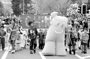 4月18日,在瑞士苏黎世举行的一年一度的“送冬节”少年儿童盛装游行上,上海世博会吉祥物“海宝”亮相,受到当地民众和游行儿童的欢迎。 新华社记者 杨京德 摄