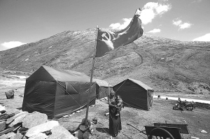 4月22日,灾区一对母女站在救灾帐篷旁。当日,记者从青海玉树县结古镇前往隆宝镇采访,一路上发现,无论是在路边的灾区群众安置点还是深山草甸,都能看到飘扬的五星红旗和党旗,看到解放军和武警战士们忙碌的绿色身影,看到政府发放的蓝色帐篷。在无情的地震过后,在废墟和蓝天白云之间,红色、绿色和蓝色总能让人心头涌起一股暖流。 新华社发