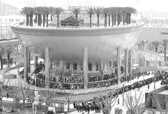 驶向中国的“丝路宝船” 4月23日,游客们排队进入世博园的沙特阿拉伯馆参观。作为上海世博会约40个外国自建馆中规模最大的场馆之一,沙特馆以“丝路宝船”为创意,象征着1000多年前就已畅通兴盛的“海上丝绸之路”,将阿拉伯和中国两大文明连接起来。新华社发