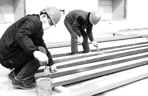 昨日,两名建设者忙碌在市体育馆一线工地。他们通过不懈努力,一所挺拔、多功能的综合性体育馆不久将展现在市民面前。(记者 沈湛 摄)