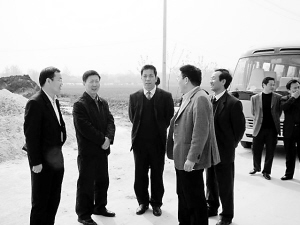 4月22日,项城市长邹洪(左二),项城市委常委、常务副市长孙鸿俊(左三)在副处级干部、项城市产业集聚区管委会主任、东方办事处主任张建党(左一)的陪同下,到项城市产业集聚区进行调研,并现场办公解决有关问题。邝越 摄