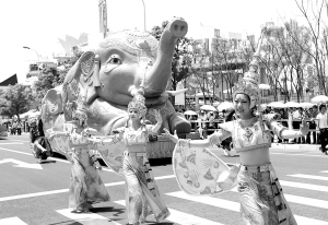 5月3日,演员们在“欢乐盛装大巡游”上表演。当日,以“带着世界的笑容、歌唱城市的未来”为主题的2010年上海世博会“欢乐盛装大巡游”在世博园举行。大巡游历时184天,分设浦东、浦西园区两条线路,将生动展示未来理想城市中多元化繁荣、和谐、欢腾的景象。 新华社记者 凡军 摄