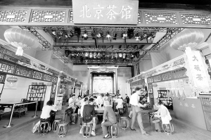 “北京茶馆”开进上海世博园 5月4日,游客在“北京茶馆”内喝茶休息。据介绍,面积约300平方米的“北京茶馆”是北京市旅游局根据老舍茶馆的元素设计而成,茶馆内的所有陈设均是从北京的老舍茶馆搬来。世博会北京活动周期间,来自老舍茶馆的表演艺术家每天将在北京茶馆里进行四场表演,游客可以在茶馆里品茗、赏乐,从中体味到浓郁的京味民俗文化。 新华社记者 罗晓光 摄