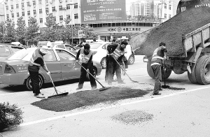 昨日,在市区八一路,市政管理处的施工人员正用沥青修补路面。 据市政部门工作人员介绍,由于今年气候变化无常,时而降温,时而下雨,造成了工期向后迁延,但经过市政管理人员的努力,到本月下旬,城区路况将得到根本好转。