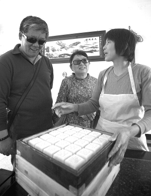 上海“世博农家”美食迎客来 5月6日,在上海市金山区廊下镇中华村,一户“世博农家”的主人蒋红珍(右)给游客介绍自己制作的农家特色方糕。上海世博会开幕以来,上海市金山区23家“世博农家”推出特色农家美食,迎接来自海内外的游客。