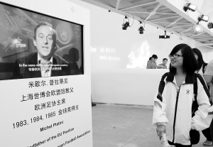 5月9日,欧洲足协主席米歇尔·普拉蒂尼在欧盟馆入口“迎接”参观者。当日,“欧洲日”庆典活动在上海世博园举行。新华社发
