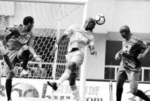 5月9日,陕西中建队外援桑托斯(中)头球抢点。当日,在2010年中国足球协会超级联赛第7轮比赛中,陕西中建队在西安主场以0比3不敌南昌八一队。