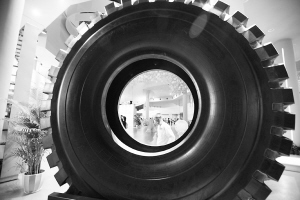 5月12日,参观者在上海世博会石油馆观看展出的巨型轮胎。据介绍,这个轮胎外直径约3.6米,断面宽约1.1米,重达4.02吨,是目前国内最大的全钢子午线工程巨胎。
