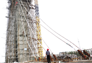 日前,大庆路桥桥身的钢丝斜拉索正在安装过程中。据该项目有关负责人介绍,整座大桥将安装40根环氧涂层平行钢丝斜拉索,现已安装12根,其余的28根将在本月底之前安装完毕。(记者 孙安平 摄)