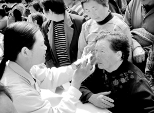 昨日上午,医疗专家在鹿邑县涡北镇算李村为当地群众进行白内障检查。由周口市委统战部、农工党周口市委联合组织的这次义诊,选派了周口各大医院的内科、普外科、骨科等著名医疗专家,开展了综合诊疗服务,当天共为200多人次的村民进行了义诊,赠送了6000多元的药品。(沈力 摄)