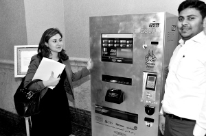 5月13日,在阿联酋首都阿布扎比,“黄金ATM机”制造厂工作人员(左)向顾客征求意见。这款被称为“黄金ATM机”的黄金自动销售柜机在阿布扎比酋长国宫大酒店启用,人们可以像操作ATM机一样,从这台柜机里购买24K的纯金金币和金条,而且其金价是根据世界黄金市场金价而自动调整的。 新华社记者 安江 摄