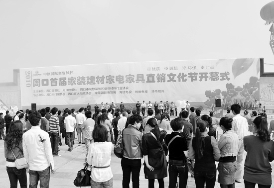 5月15日至16日,2010“中原国际商贸城杯”周口市首届家装建材家电家具直销文化节在五一广场隆重举行,现场云集了我市65家知名家装、建材、家电、家具品牌和企业,吸引众多市民前往会场参观咨询。图为开幕式现场。(记者 沈湛 王映 摄)