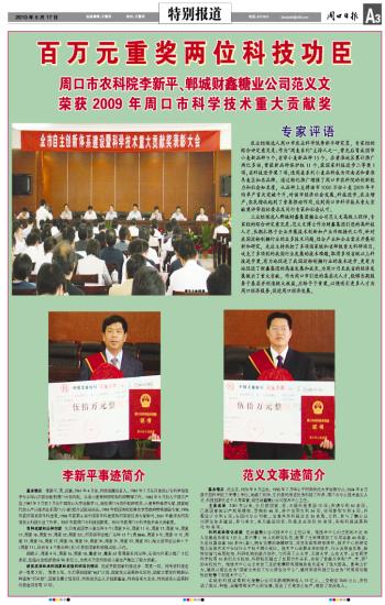 农业组候选人周口市农业科学院李新平研究员,专家组的综合评定意见是:作为“周麦系列”主持人之一,曾先后育成国审小麦新品种9个,省审小麦新品种13个。在黄淮地区累计推广两亿多亩,曾获新品种保护权11个,获国家科技进步二等奖1项,省科技进步奖7项,使周麦系列小麦品种成为河南省和黄淮冬麦区知名品牌。通过转化推广增强了周口市农科院的创新能力和社会知名度,从品种上支撑该市1000万亩小麦2009年平均单产首次突破千斤,对该市经济社会发展,科技进步,农业增产,农民增收起到了重要推动作用,达到周口市科学技术重大贡献奖评审指标要求及同行专家和社会认可。