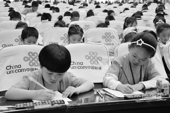 5月15日,我市举行第五届“神墨杯”心算小博士周口争霸赛,来自各县(市、区)的500多名小选手参加了比赛,此次比赛年龄最小的选手4岁,最大的12岁。图为比赛现场。 记者 孙安平 摄