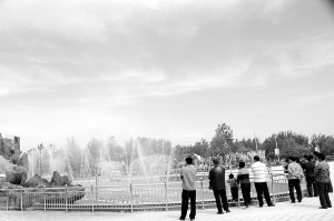 5月7日,一些市民正在永基广场观看音乐喷泉。当日,沈丘县第一座音乐喷泉在永基广场建成,它能随着音乐节奏变幻多种造型,特别是晚上,华灯齐放、绚丽多彩的景象更让人陶醉。(董国俊 摄)