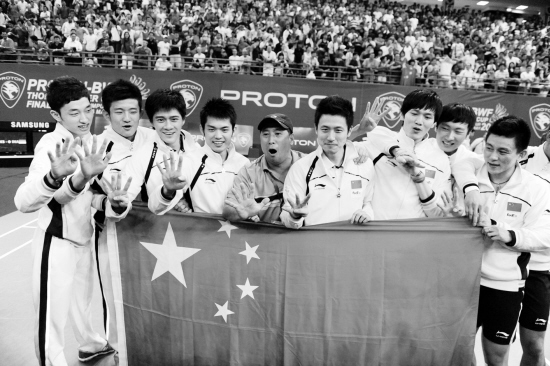 5月16日,中国队在比赛后庆祝。当日,在马来西亚吉隆坡举行的2010年汤姆斯杯羽毛球男子团体赛决赛中,中国队以3比0战胜印度尼西亚队,取得汤姆斯杯的四连冠。 新华社记者 宋振平 摄