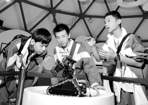 用蓝牙控制的机器人引起了郑钧(中)的兴趣(5月2日摄)。郑钧课余喜欢学习研究计算机编程,他觉得这样的技术如果运用到抗震救灾中,会极大提高救援效率。