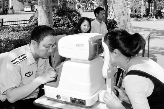 昨日,市质量技术监督局川汇分局的工作人员为市民进行视力检测。5月20日是世界计量日,我市质监部门设立宣传点,向市民大力宣传计量法律法规和常用计量器具知识。(记者 李寒 摄)