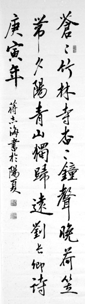 蒋志海,1969年生于河南省太康县。书法作品曾在《青少年书法》、《书法报》上发表,并在《首届中国小作品书画作品大赛》、《全国书画艺术分科展》等大型书法展中入选并获奖。现为河南省书法家协会会员,全国青少年书法家协会会员。